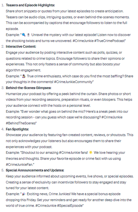 I asked AI, “Give me 5 content ideas to post on social media for my podcast, “Crime Junkie,” and here’s what I got: